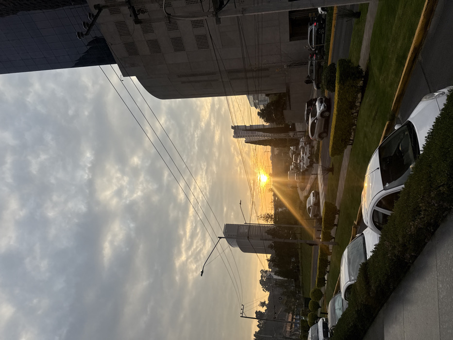 A building is seen on the left side of the frame with windows facing up, and an overcast sky with a sun in the distance. Electrical wires crisscross the sky, and light poles are placed intermittently along the horizon. A line of parked cars is set off by a green grass lawn. The scene is rotated counterclockwise.