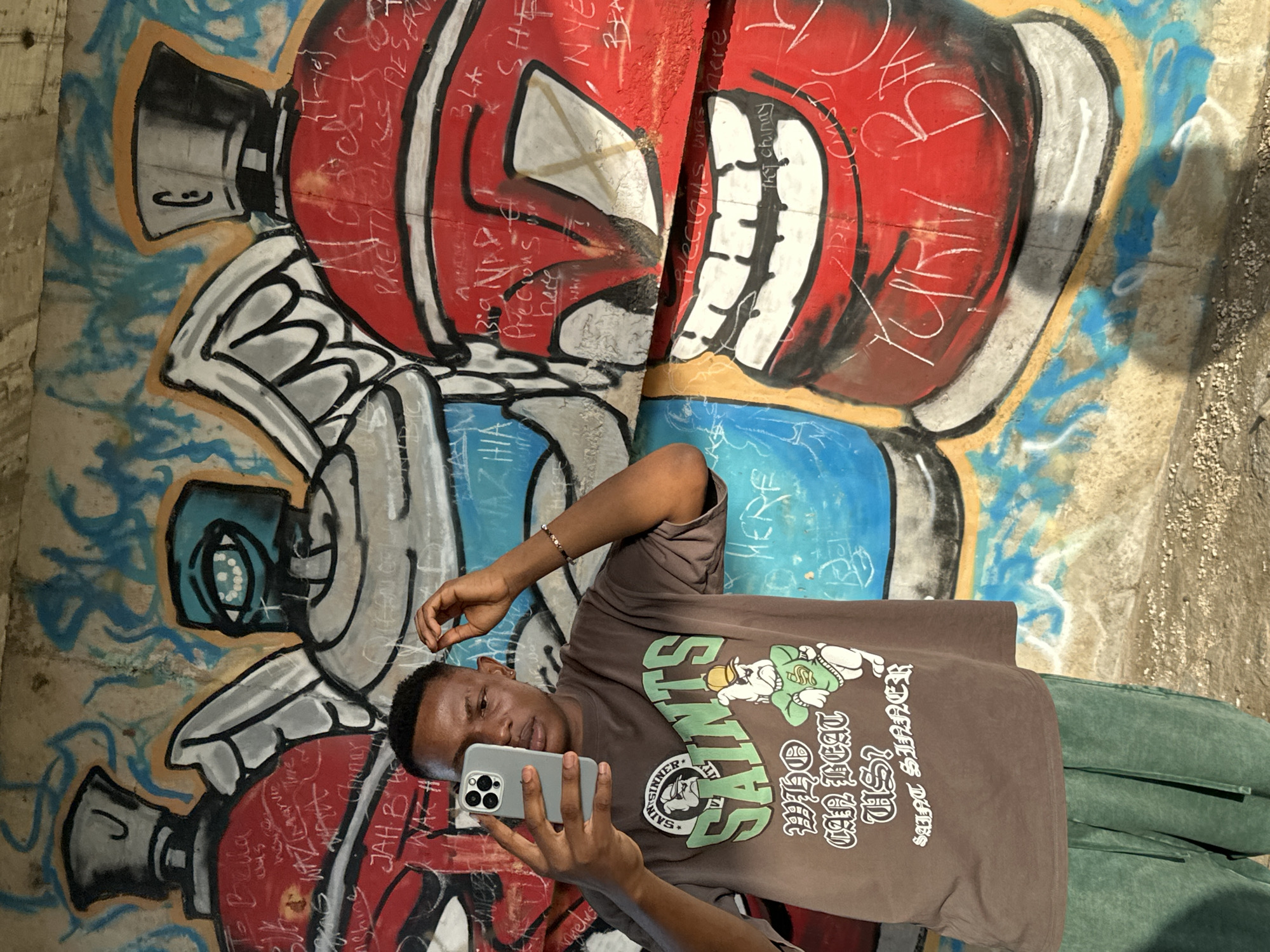 A young man is seen taking a selfie in what appears to be an underpass or tunnel. The location may be in Ihiagwa, Nigeria, though this is unconfirmed by the image alone. He is holding a smartphone, angled to capture his face, upper body, and part of the background. The man wears a brown t-shirt with a graphic design featuring the word "SAINTS" in green lettering, along with other text and an image of a cartoon character holding a dollar sign. He also wears green sweatpants and a bracelet. The background consists of a concrete wall covered with colorful graffiti artwork. The artwork appears to feature cartoonish, spray-paint-style characters, and various tags and writings. The lighting is somewhat dim, and the camera angle is slightly off-center.