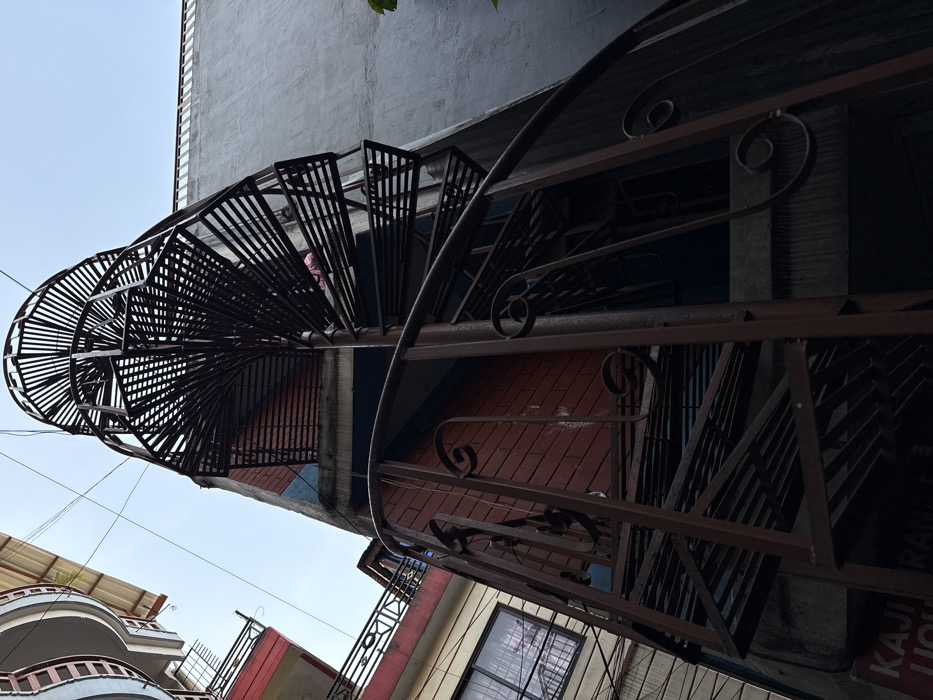The image displays an urban environment in Pokhara, Nepal, captured from a low-angle perspective looking upwards. A prominent, dark-brown metallic spiral staircase dominates the center-right, featuring open grid treads and scrolled handrails. This staircase is affixed to a multi-story building characterized by sections of red brick facade, some with blue paint discolouration, and a plain, dark grey concrete wall. A pink textile object is visible on one of the upper treads of the spiral staircase. To the left, a multi-story building with light-colored walls, red balcony trim, and black metal railings is partially visible, showing windows with internal coverings. A third, distinct building with a curved architectural profile appears in the top-left. The sky is overcast and light grey, crisscrossed by multiple black utility wires. A small amount of green foliage is present on the far right. The lower portion of the scene is shadowed, revealing partial signage on a business fascia that includes the words "KAJI" and "RAJ". No individuals are visible.