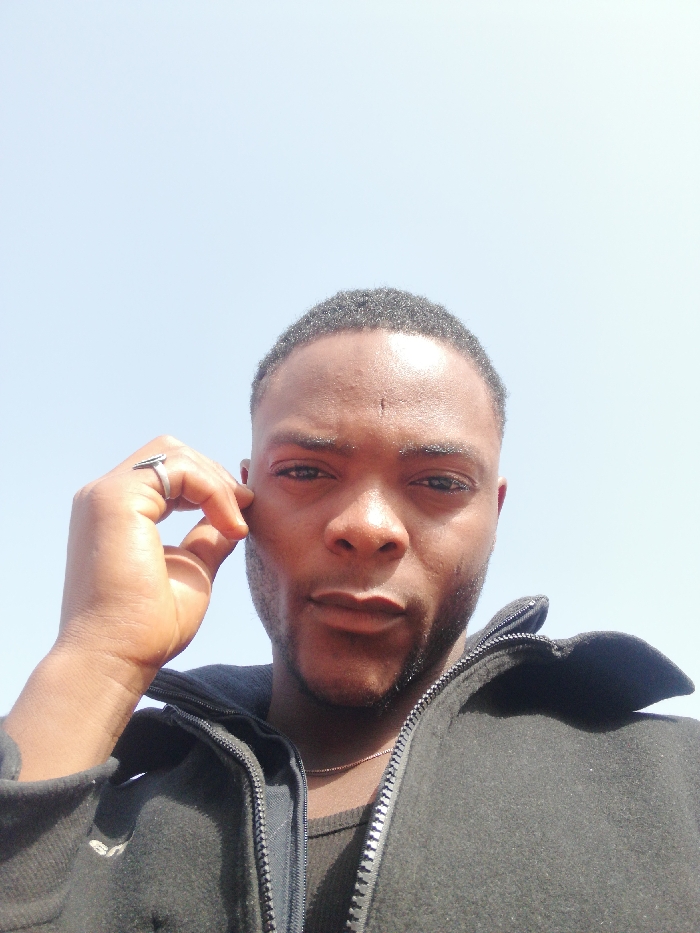 A close-up shot captures a dark-skinned man with short, dark hair and a trimmed beard. He wears a black jacket with a visible zipper and a silver necklace. His hand, adorned with a silver ring, is positioned near his face. The background reveals a clear, light blue sky, suggesting an outdoor setting. His expression is neutral, with a direct gaze towards the camera.