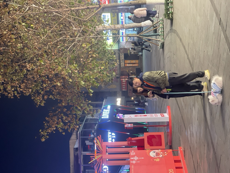 The image depicts a nighttime urban scene in Chongqing High-tech Zone, China. In the foreground, a light-skinned couple stands on a paved pedestrian area. The male, wearing an olive-green jacket, dark pants, and light-colored shoes, holds a bright green dog leash attached to a small, fluffy white dog. The dog, wearing a blue plaid outfit, is lying prone on the ground in front of the couple. The female, wearing a white and dark-trimmed jacket and dark pants, stands slightly behind the male. Both individuals are looking down at a smartphone held by the female. To the left, a large red festive structure with "HAPPY NEW YEAR 2020" and Chinese characters, including "福" (fú, blessing/good fortune) and a cartoon rat, is prominently displayed. Adjacent to it are two white vertical kiosks with red accents, one featuring a smartphone screen and possibly QR codes. Behind these structures, a building with glowing blue neon signs, including "LOVE K KTV" and "1F," is visible. The background features other pedestrians walking, various illuminated storefronts with Chinese text, and several deciduous trees with sparse, autumn-colored foliage. Streetlights and building lights illuminate the scene, casting soft shadows on the pavement.