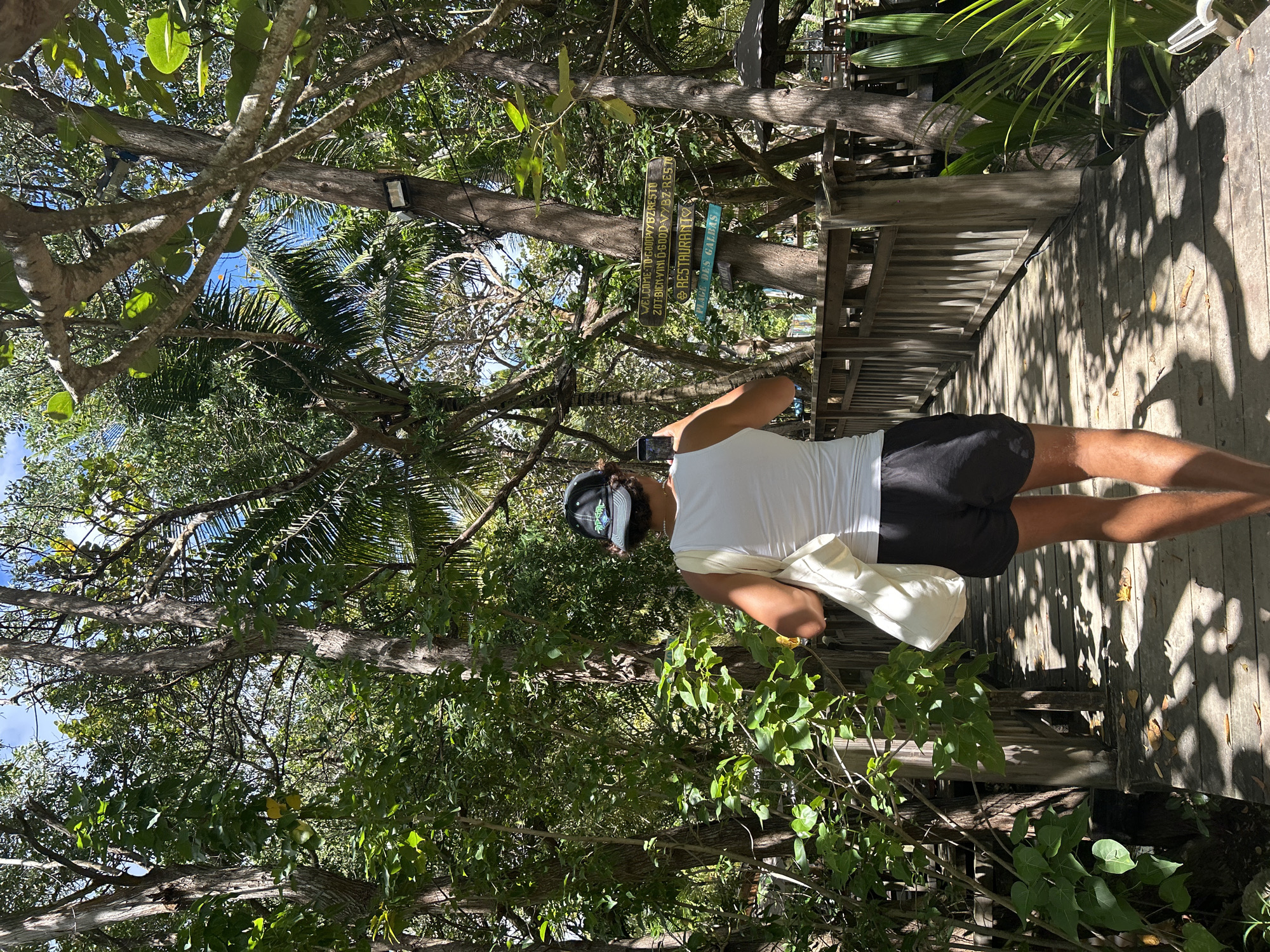 A man stands on a wooden boardwalk surrounded by trees and foliage, taking a photo with his phone. He is wearing a white tank top, black shorts, a cap, and a shoulder bag. Above him, hanging from a tree branch, is a sign indicating the location as "GOOD VYBZ RESTAURANT" and its welcome in multiple languages. The scene appears to be outdoors in a tropical or semi-tropical setting. The precise location is the city of Sainte-Anne, France.