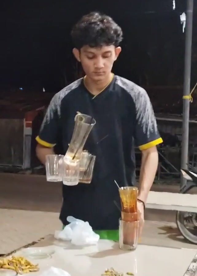 A young man with curly hair is standing behind a white table outdoors at night. He is wearing a black T-shirt with yellow accents and green shorts. He is holding several glasses in his hands, some stacked on top of each other, and some held separately. The table in front of him has several other glasses, snacks, and a plastic bag. In the background, there are some buildings and a motorbike. He appears to be clearing or organizing the glasses.