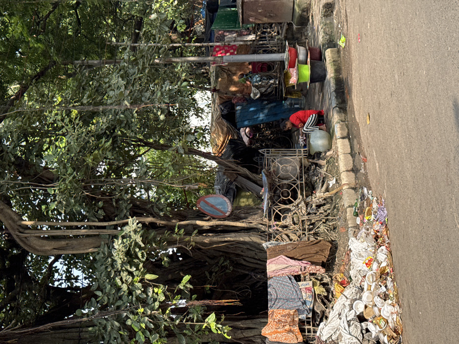 This image depicts a roadside scene in Kolkata, India, during daylight hours. A large tree, consistent with a banyan due to its prominent aerial roots and expansive trunk, dominates the background. Beneath its canopy, a series of informal shelters constructed from tarpaulins and various fabrics are present. In the mid-ground, a young individual, dressed in a red long-sleeved top and black-and-white striped pants, is seated on the concrete curb. They are actively engaged with a large, light-colored plastic basin placed on the ground in front of them, with their hands submerged, indicating a washing or water-based task. To their immediate right, a stack of colorful plastic basins (green, red, and black) is neatly arranged. Adjacent to the tree and extending across the mid-ground is a segment of a decorative metal railing, over which several articles of patterned clothing are hung to dry. A "No Parking" sign (red circle with a blue diagonal line) is visible, affixed to one of the tree's structures. In the foreground, a substantial accumulation of refuse, including plastic containers, wrappers, and general debris, is scattered across the asphalt road surface and along the base of the curb, extending from left to center. The environment suggests an informal urban settlement integrated with a public thoroughfare.