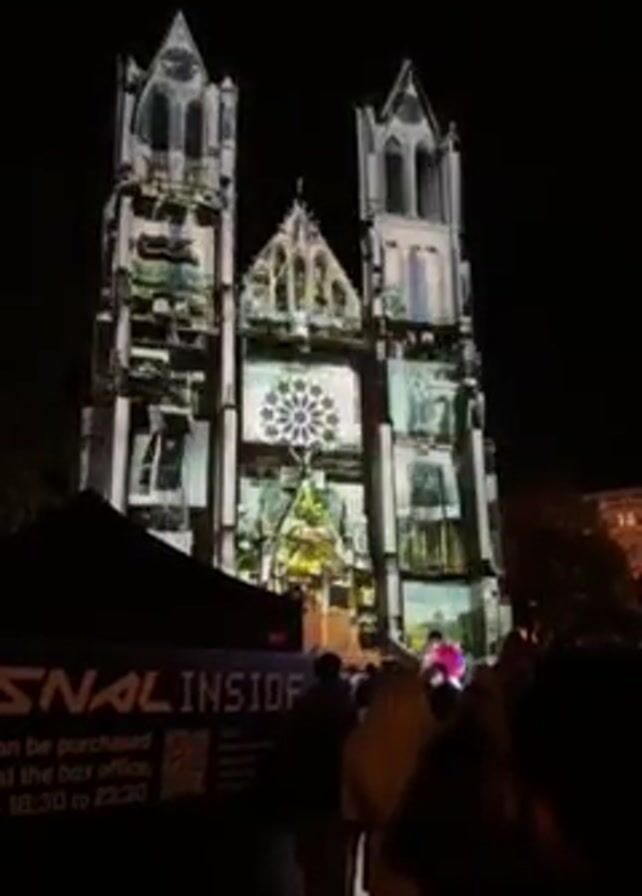 A gothic-style building is illuminated by a light show in this nighttime video. The building has two towers and is made of light-colored stone. The light show projects images onto the building's surface, including geometric shapes, abstract designs, and scenes of nature. A crowd of people stands in front of the building, watching the light show. Some people are wearing bright clothing. A dark tent stands in the foreground on the left, and a sign is partially visible on the tent that reads "SIGNAL INSIDE". The overall atmosphere is festive and engaging.