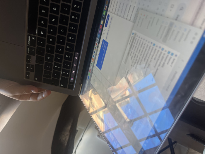 The image displays an open silver-grey laptop computer, likely a MacBook, positioned indoors in Paris, France. A light-skinned hand rests on the right side of the laptop, near the keyboard and Touch Bar. The keyboard is dark grey-black with white lettering, featuring a French layout with a 'Ç' key. The illuminated Touch Bar displays icons for volume and brightness control. The laptop screen is highly reflective, showing a distinct grid pattern of bright blue rectangles, indicative of a multi-paned window or skylight reflecting a clear blue sky. Below this, warmer, orange-toned light is reflected, suggesting an indoor light source or exterior natural light. The visible portion of the screen's content shows an open application with a light background, displaying lists of items, likely files or documents. The immediate background behind the laptop is out of focus, revealing indistinct room elements. The scene depicts a person either actively using or preparing to use the laptop in a sunlit interior space.