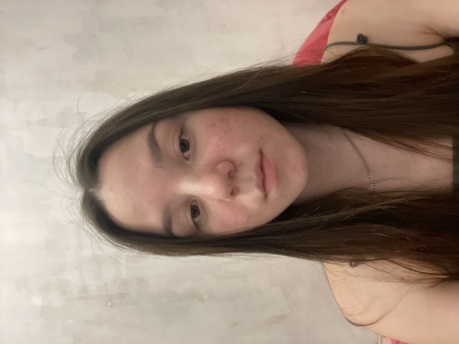 The scene is an indoor environment in the city of Ольховка, Russia, captured in an eye-level portrait of a single female subject. She is positioned centrally, facing directly towards the camera with a neutral expression. Her long, straight dark brown hair is parted in the middle and extends over her shoulders. The subject's brown eyes gaze forward, and her mouth is closed in a flat line. Her skin exhibits areas of redness and multiple small blemishes across the cheeks, forehead, and chin. She wears a dark-colored garment with thin spaghetti straps, and a thin silver-colored chain necklace is visible around her neck. The background consists of a plain, light-colored wall with a subtle brushed or textured finish. A red object is partially visible behind her right shoulder on the right side of the frame.
