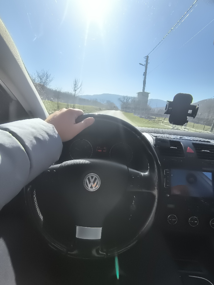 - "The image presents a first-person view from the driver's seat of a Volkswagen vehicle, situated in the city of Byala Palanka, Bulgaria, under a bright, clear sky" by FM-ZGyvI3, licensed under CC BY 4.0