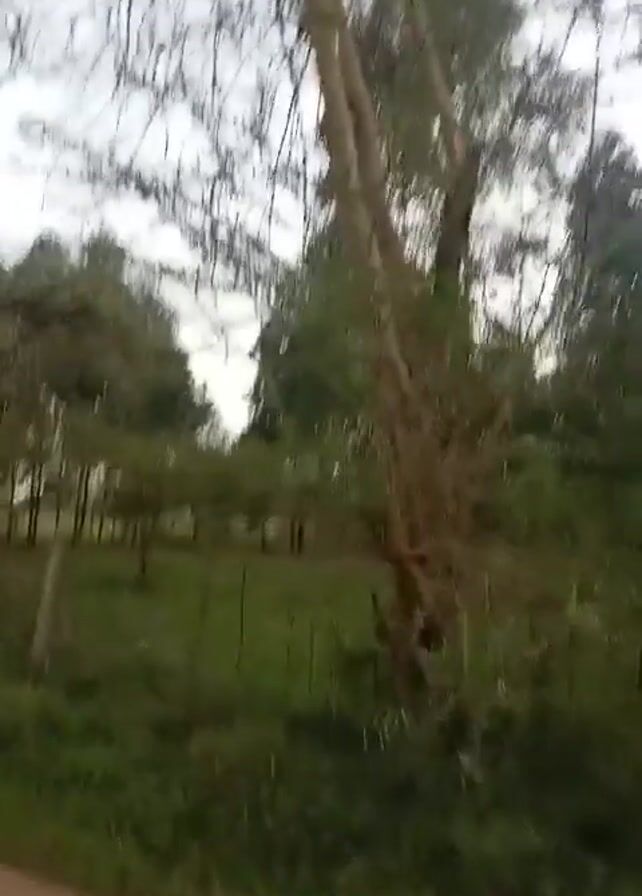 The camera is moving forward along a narrow, dirt road. The road is flanked by dense green foliage, including trees and bushes. A tall, gray utility pole stands on the left side of the road. Above, the sky is overcast, with bare tree branches silhouetted against the pale sky.