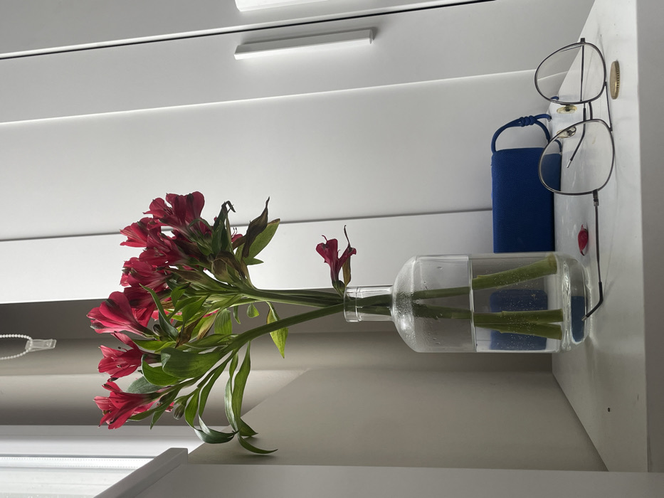 A clear, repurposed glass bottle serves as a vase, holding water and a cluster of vibrant red flowers with green stems and leaves. The bottle sits on a white surface against a matching white backdrop. To the right, a blue cylindrical object is flanked by a pair of glasses with round lenses. A coin and a small red object are also attached to the white wall behind the glasses. The setting has a minimalist and clean aesthetic.