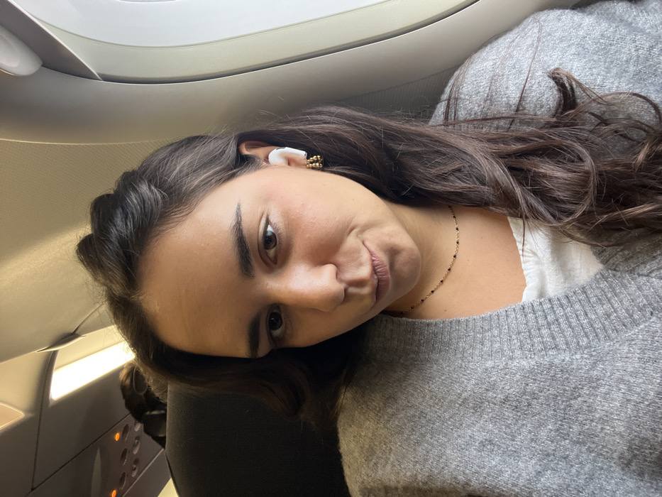 A female subject is depicted in a close-up selfie taken inside a commercial aircraft cabin. She has long, dark brown hair and wears a grey V-neck cardigan over a white top, accented by a delicate gold-colored chain necklace with small black beads. A white wireless earbud is present in her right ear, alongside a small gold-colored beaded hoop earring. Her expression is characterized by slightly pursed lips, and she gazes directly at the camera. In the background, an airplane window shows a brightly lit exterior, and parts of the aircraft's overhead paneling and a dark seat headrest are visible. The setting is an aircraft cabin, located at or associated with Paris-Charles de Gaulle Airport in Tremblay-en-France, France.