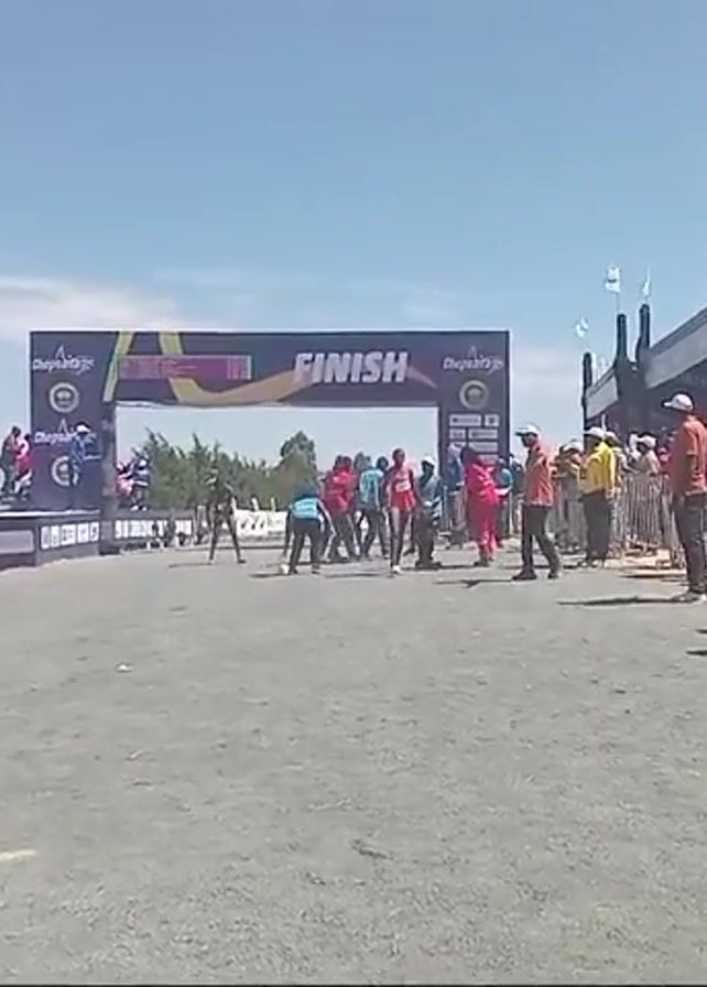 finish line of a race, with people gathered around. A group of medical personnel carries a runner on a stretcher toward the right of the frame. The runner is lying on their back, motionless, on the stretcher. Other runners and race officials are milling around. There is a stage with people on it behind the finish line. The sky is blue and there are some clouds.