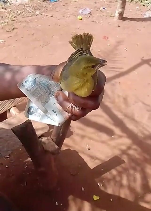 person's hand holding a small yellow bird and some banknotes outdoors. The bird is perched on the person's palm, and the banknotes are crumpled in the same hand. The bird moves its wings slightly. The background consists of reddish-brown dirt, some grass, and what appears to be a tree trunk. There is also some trash scattered around in the background. The person's arm is visible, and they are wearing a light-colored garment. The scene is in bright sunlight. The camera is static, and the shot is close-up.