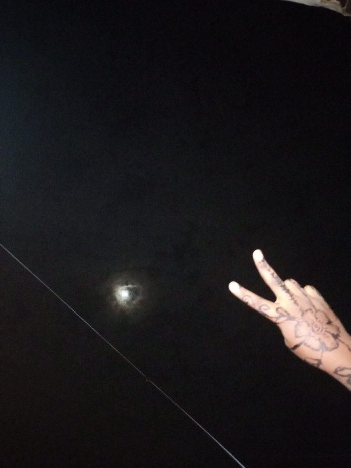A nighttime scene shows a hand decorated with henna in a peace sign gesture. In the dark sky, a faint moon is visible, with a powerline running diagonally across the image. The composition is dominated by darkness, highlighting the contrast between the bright fingers and the moon. The hand features a large flower design and other intricate patterns.