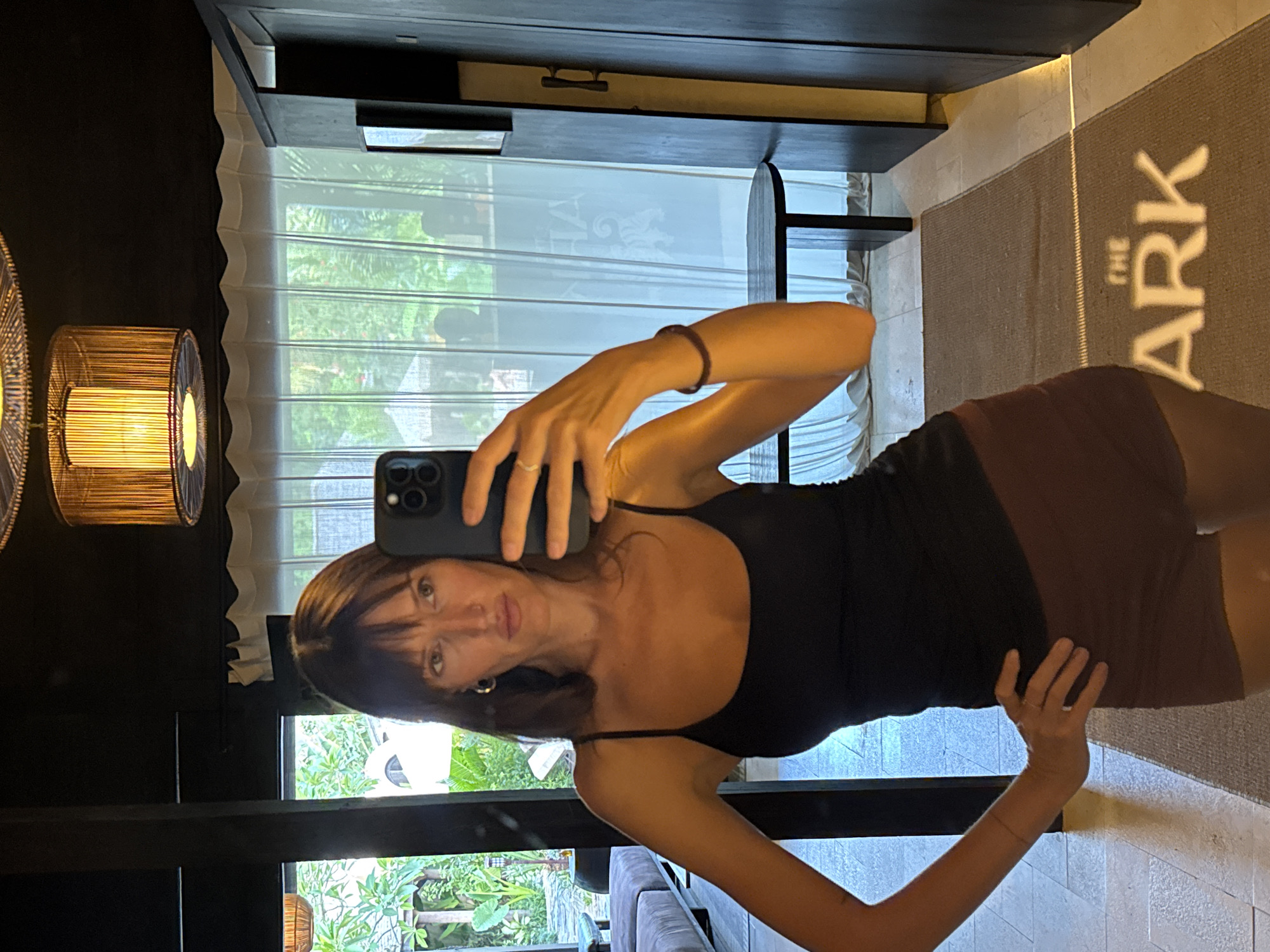 A woman is taking a selfie in front of a mirror, which reflects an outdoor view and interior decor. The text "THE ARK" is visible on a rug, which is located in Pererenan, Indonesia. The woman is wearing a black tank top and a brown skirt. She is holding a black smartphone. The background includes a black furniture piece, a decorative lamp, and a window with white curtains. The outdoor view shows green trees and foliage.