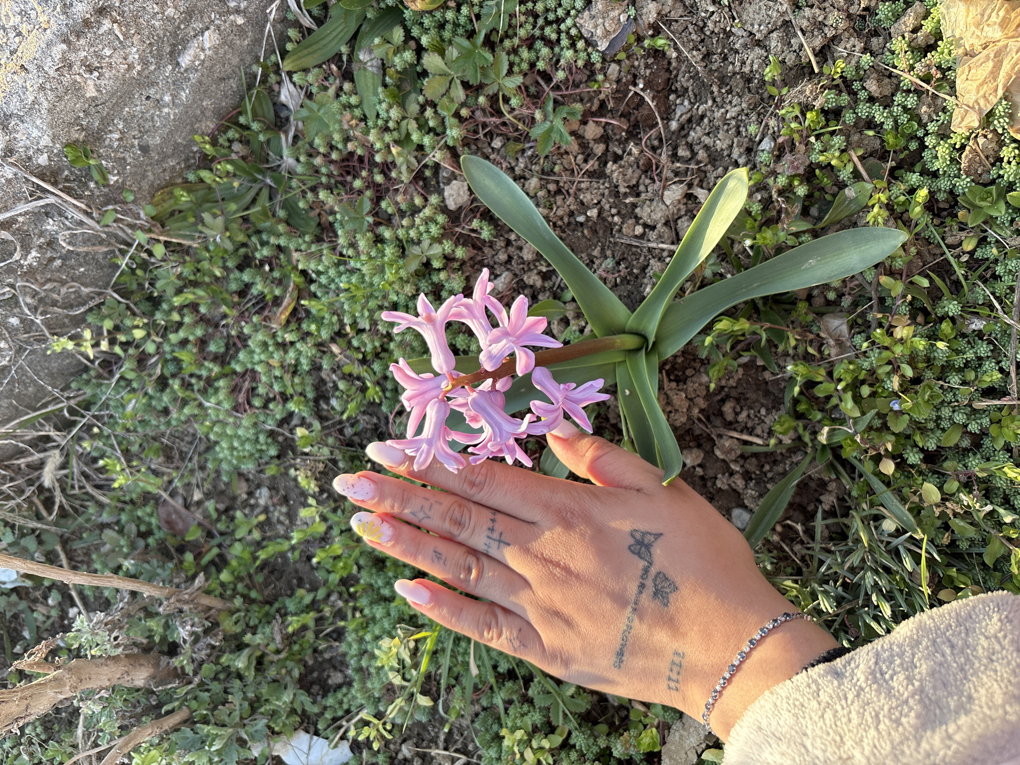 The image depicts an outdoor ground-level scene in Shumata, Bulgaria, focusing on a human hand positioned next to a flowering plant. A pink hyacinth plant, approximately 20-25 cm tall, stands centrally, featuring multiple bell-shaped pink florets on a stalk and several green, sword-shaped leaves at its base. To the left, a light-skinned human hand with manicured fingernails is present. The nails are painted light pink, with the index finger displaying a yellow floral design and the middle finger exhibiting light pink with dark pink speckles. The back of the hand and fingers bear multiple small black tattoos, including numerical "11:11", a butterfly-like design, and several abstract symbols. A silver-toned bracelet with alternating light and dark stones is worn on the wrist. The cuff of a light-colored, possibly beige, textured garment is visible in the lower left corner. The surrounding ground consists of dark brown soil, interspersed with various small green ground cover plants, including clusters of small, round-leaved succulents and other broader-leaved vegetation. Patches of dried brown foliage and bare soil are also visible. In the upper background, dry, leafless woody branches are present. A textured concrete or stone surface is partially visible along the right edge. Strong natural light illuminates the scene, casting subtle shadows.