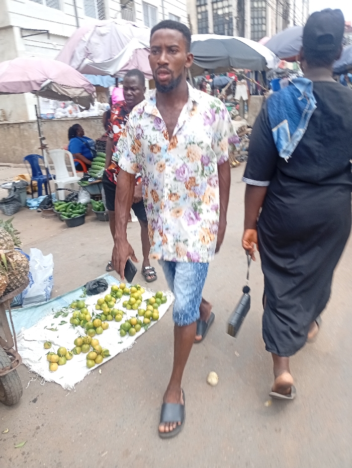 The image depicts a bustling street market scene in Onitsha, Nigeria. In the foreground, a young adult male with a beard and short dark hair walks towards the viewer, slightly right of center. He wears a short-sleeved white shirt with a floral pattern, blue distressed denim shorts, and black slide sandals. His right hand holds a black smartphone. To his right, the back of an individual wearing a long-sleeved black tunic and black sandals walks away from the viewer, holding a black, cylindrical object, possibly a folded umbrella or water bottle, in their left hand. A small, light-colored object, possibly a piece of fruit or debris, lies on the paved ground between these two individuals. To the left of the man in the floral shirt, a makeshift market stall is visible. A white cloth is spread on the ground, displaying numerous small, green to yellowish-green citrus fruits (likely oranges or tangerines) in clusters. Next to this, the wheel and bottom portion of a metal cart with pineapples are partially visible. Further back on the left, under a large, light-colored market umbrella, another person is partially visible, and baskets containing green vegetables (possibly cucumbers or plantains) are arranged on the ground. A woman in a blue top is seated behind these items. In the mid-ground, a man in a patterned shirt walks between the main subject and the market stalls. The background is filled with more market activity, including several large, dark-colored market umbrellas providing shade over various goods. Multi-story buildings with grated windows are visible behind the market structures, indicating an urban setting. The overall environment suggests a vibrant, active commercial street in Onitsha.