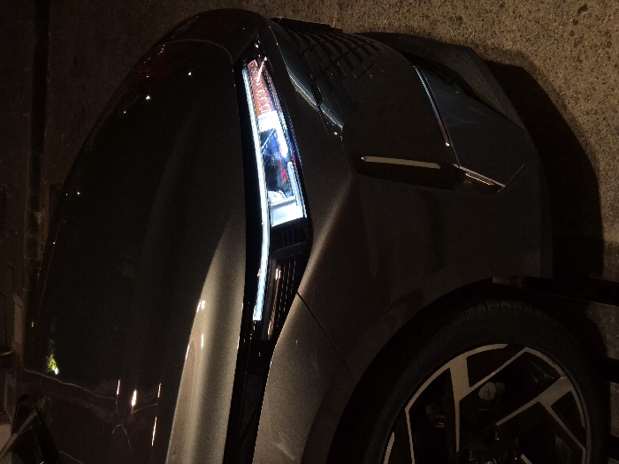 A close-up, low-angle shot showcases the front quarter of a dark-colored vehicle. The prominent headlight features a vertical LED strip. The vehicle's hood, fender, and front tire are visible. The wheel has a geometric design with a silver rim. The vehicle is positioned near a wall, enhancing the play of light and shadow on its surface.