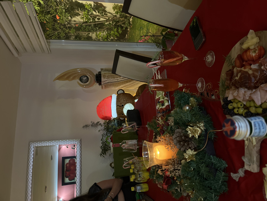 - "A festively decorated table features a Christmas wreath with a lit candle, glasses filled with drinks and candy canes, a charcuterie board piled with meats, cheeses, fruits, and olives" by FM-v8bHp1, licensed under CC BY 4.0