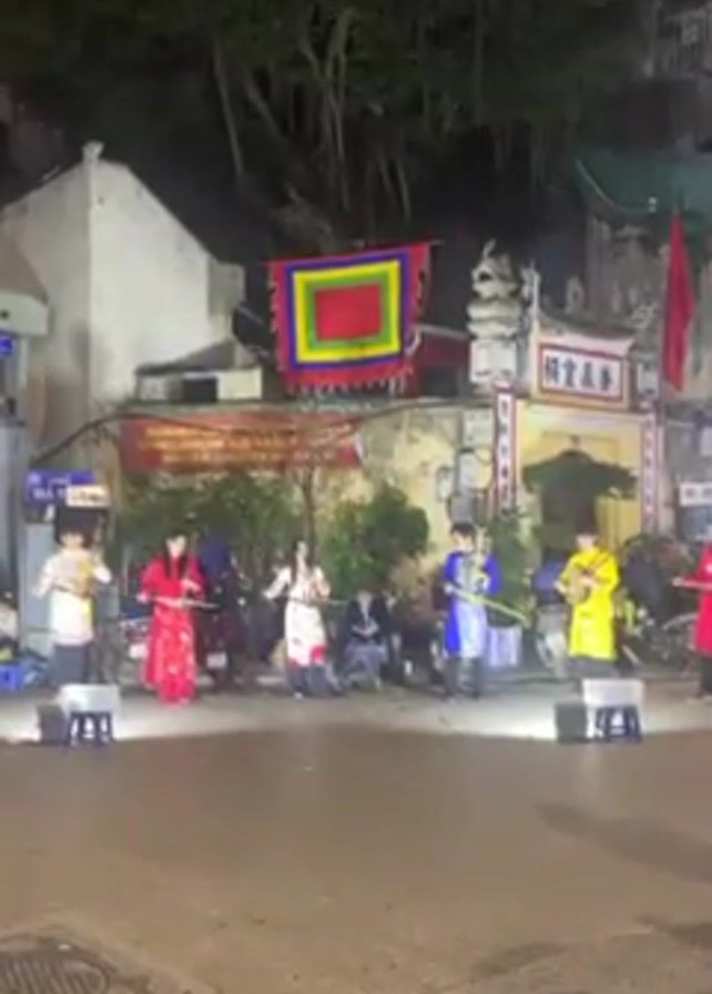 group of musicians performing on a street in Vietnam, at night. There are six musicians, all wearing traditional Vietnamese clothing in different colors: white, red, blue, and yellow. They are playing stringed instruments. They are positioned in front of a building adorned with a colorful square flag, banners, and other decorations. A few pedestrians pass by, showing slight interest in the performance. The street is paved and lit. Above, there's a lush tree canopy. The overall setting suggests a cultural or festive event in an urban environment.