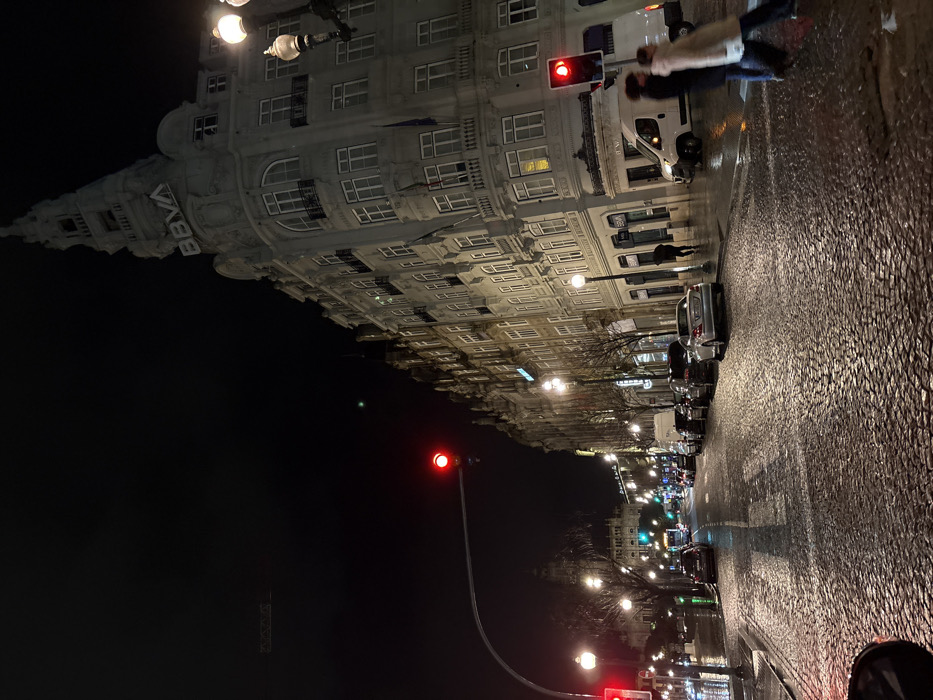 A nighttime urban scene features a tall, ornate building with the letters "BBVA" visible. The street is paved with cobblestones and lined with parked cars and streetlights. Red traffic lights are prominent, and a pedestrian crossing is visible with people walking. The overall atmosphere is dark and potentially wet, given the reflections on the pavement. The image is oriented sideways.
