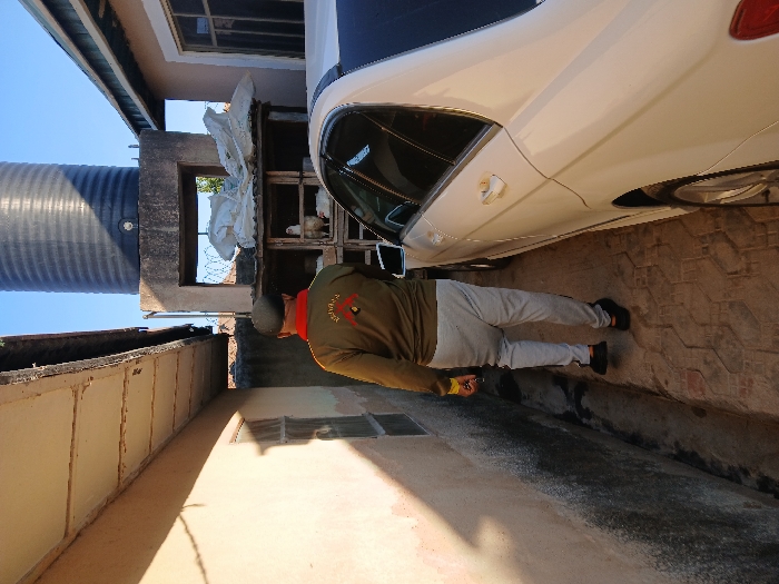 A man in a green jacket and grey pants stands beside a white car in a narrow alleyway. A large water tank looms above a building with a window and white materials inside. A weathered wall runs along the alley, casting shadows. The ground is a patterned brick or stone. The car occupies a significant portion of the frame.