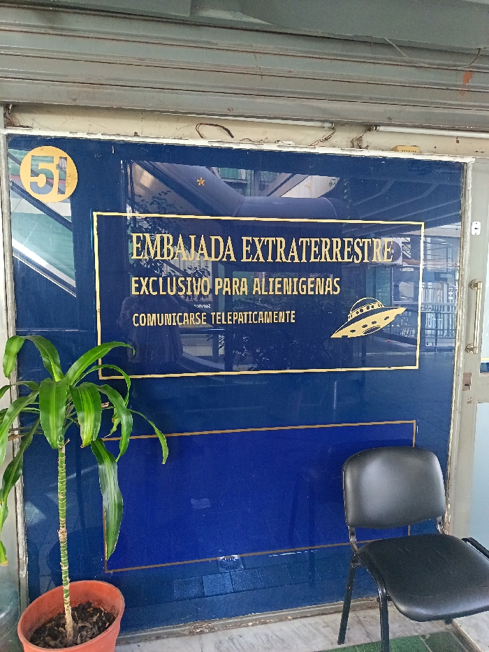 The scene depicts the street-level entrance of a building at Defensa 51, San Telmo, Buenos Aires, Argentina. The primary feature is a dark blue, reflective glass or acrylic sign covering most of the double doorway. The sign displays gold-colored text centered within a gold frame: "EMBAJADA EXTRATERRESTRE" (Extraterrestrial Embassy), "EXCLUSIVO PARA ALIENIGENAS" (Exclusive for Aliens), and "COMUNICARSE TELEPATICAMENTE" (Communicate Telepathically). A gold-colored graphic of a flying saucer is positioned to the right of the lower text. A yellow circular plaque with the number "51" in dark blue is affixed to the upper left corner of the door frame. Above the doorway, a grey metallic roll-down security shutter is partially retracted, exposing a light fixture and electrical wiring within the recess. To the left of the doorway, a potted plant with green, elongated leaves is contained within an orange terracotta pot. To the right, a black, four-legged chair with a simple black seat and backrest is positioned. The immediate ground in front of the entrance consists of light-colored, possibly marble or tiled, flooring. Reflections on the dark blue sign depict elements of the urban environment across the street, including building facades and a partial human figure. No individuals are actively interacting with the entrance.
