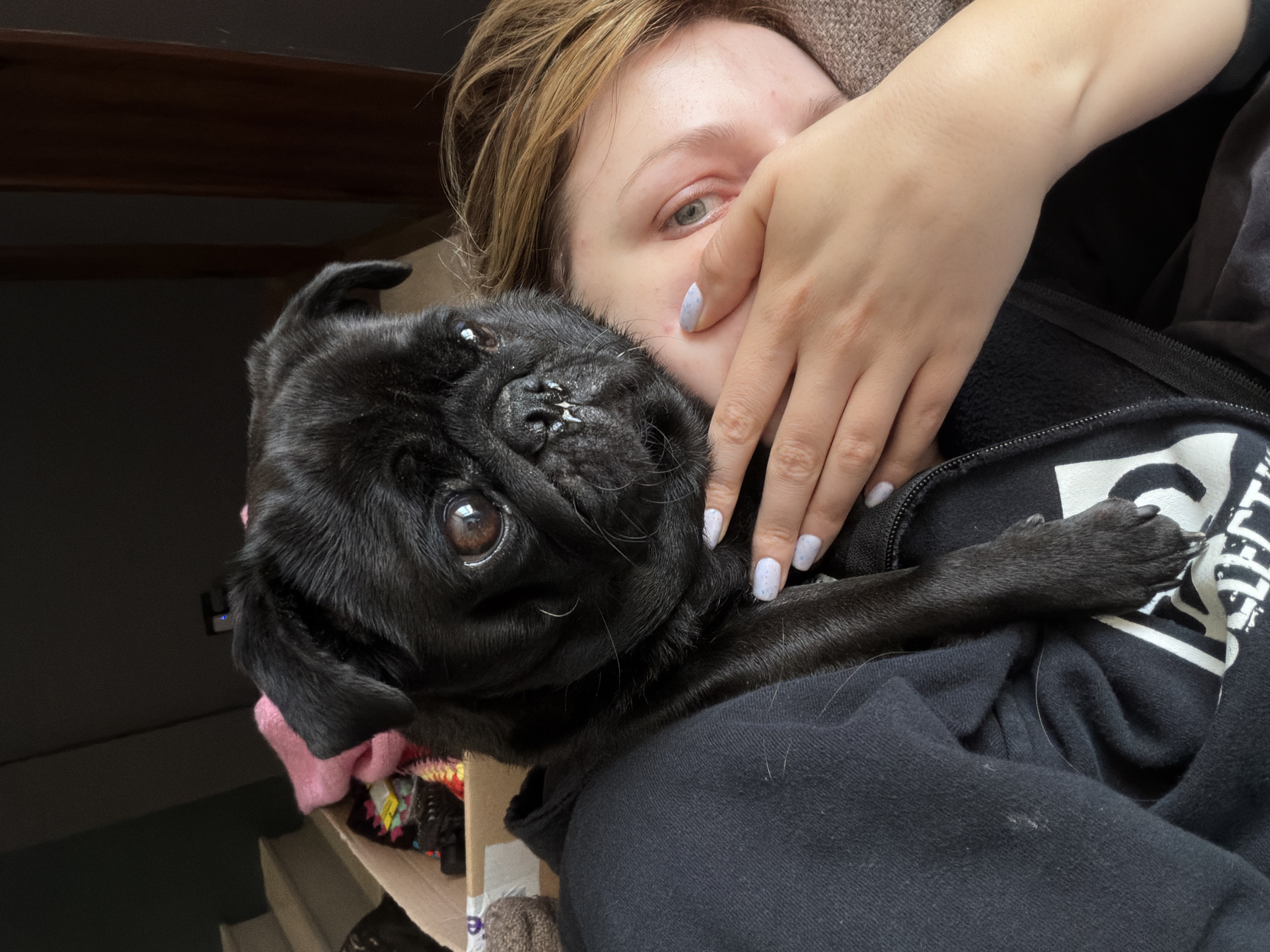 A woman is holding a black pug close to her face. The woman has short, blonde hair and light skin. Her right hand is partially covering her face. She has painted nails, which appear light blue with white speckles. She is wearing a black zip-up sweatshirt with white lettering on the right breast. The pug is looking at the camera. A box of miscellaneous items are below the pug, near the edge of a surface on which it rests, partially obscured. A brown patterned surface is visible at the top of the image. The location of the photo, Razlog, Bulgaria, is not visible and cannot be determined from the image.