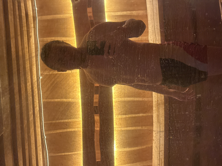 A person stands in a shower with water cascading over them. The individual, facing sideways, is partially obscured by the water spray but appears to be wearing dark swim trunks with a red and white waistband. The shower features vertical panels illuminated with golden light. A metallic shower hose runs along the left side. The scene is taken from a low angle, giving a slightly distorted perspective.