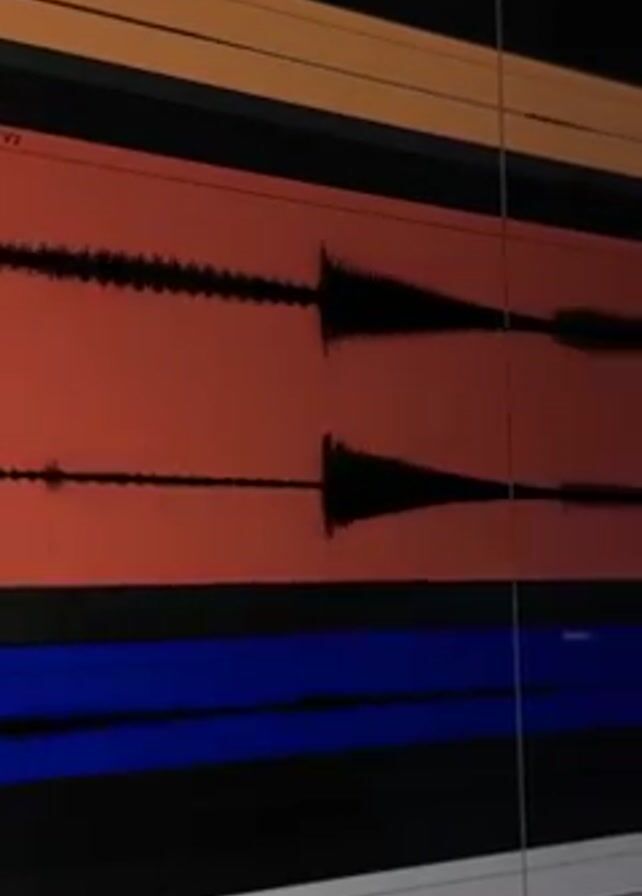 A close-up shot shows a computer screen displaying an audio editing interface. The software presents multiple audio tracks distinguished by different colors: orange, red, and blue. The waveforms of the audio signal are visible within each track. The screen is lit with the glow from the software.