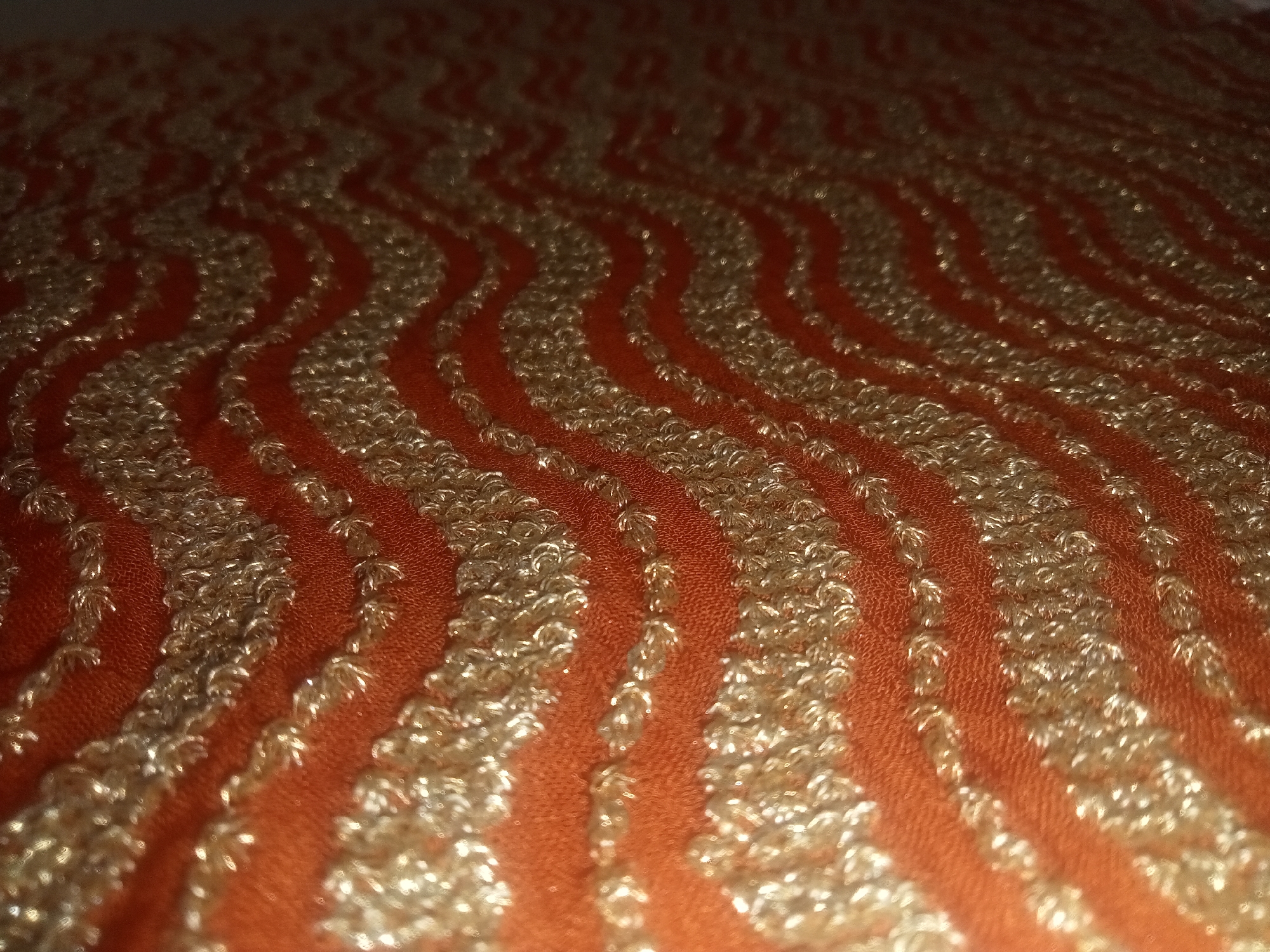 close-up of a textured fabric, likely a cushion or upholstery. The fabric has an orange base color with wavy patterns formed by small, densely packed, light-colored elements that appear to be thread or some other decorative material. The waves run diagonally across the image. The image is taken at a close range, obscuring details about its surrounding environment. There is no information about people, subjects, objects, actions, or interactions in the image, nor is there data to place the photograph in Mansehra, Pakistan.