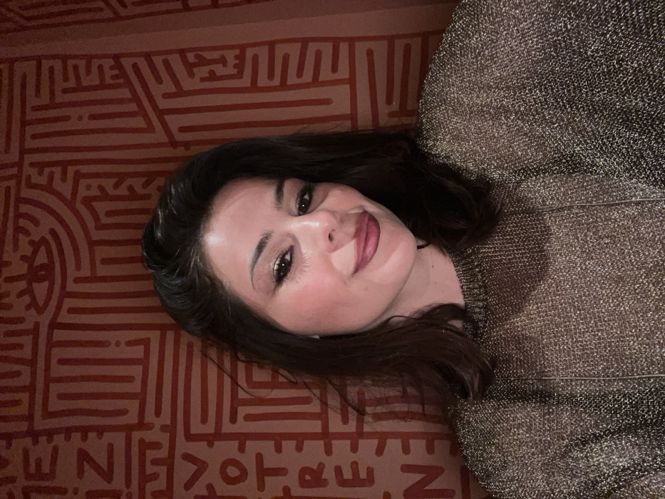 A female individual, appearing in her late 20s to early 30s, is centered in a chest-up self-portrait