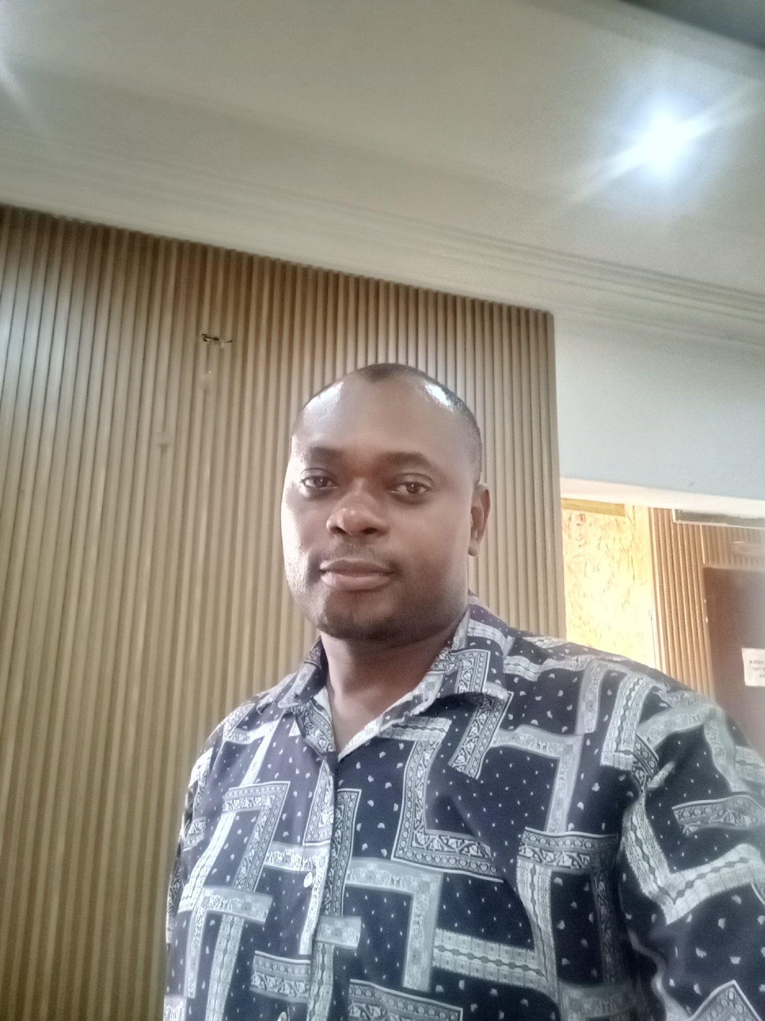 The image displays a headshot-style portrait of an adult male captured indoors. The subject, positioned centrally, has a dark skin complexion and short, closely cropped dark hair or a shaved head. He is looking directly at the camera with a neutral expression. He is wearing a short-sleeved, collared button-up shirt with a dark base color (appearing black or dark blue) featuring a repeating pattern of light-colored (white/light grey) geometric designs and small scattered dots. The background consists primarily of a vertically paneled wall behind and to the left of the subject, characterized by light brown or beige ridged panels. Above the paneling is a plain, light-colored ceiling (white/off-white) with crown molding near the wall junction. A bright, undefined light source is visible on the upper right portion of the ceiling. A small, dark, irregular object, possibly an insect or blemish, is present on the wall paneling above and slightly to the left of the subject's head. To the far right, a partial view of another wall section or doorway with a patterned surface and a small white rectangular object, possibly a sign, is visible. The scene is an interior setting. While the request specifies Gwarinpa, Nigeria, there are no specific visual indicators within the image to confirm this precise geographical location.