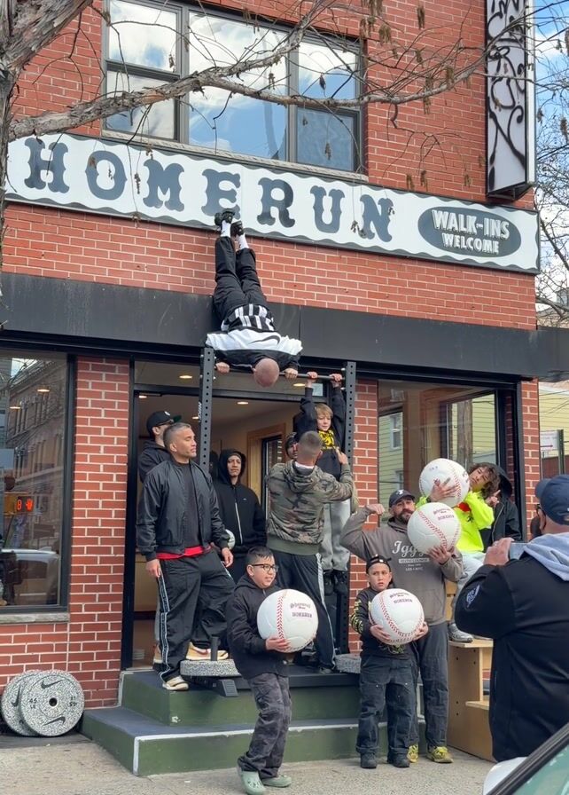 In front of a brick building with "HOMERUN" signage, a person in black-and-white attire performs a handstand on a pull-up bar attached to the building