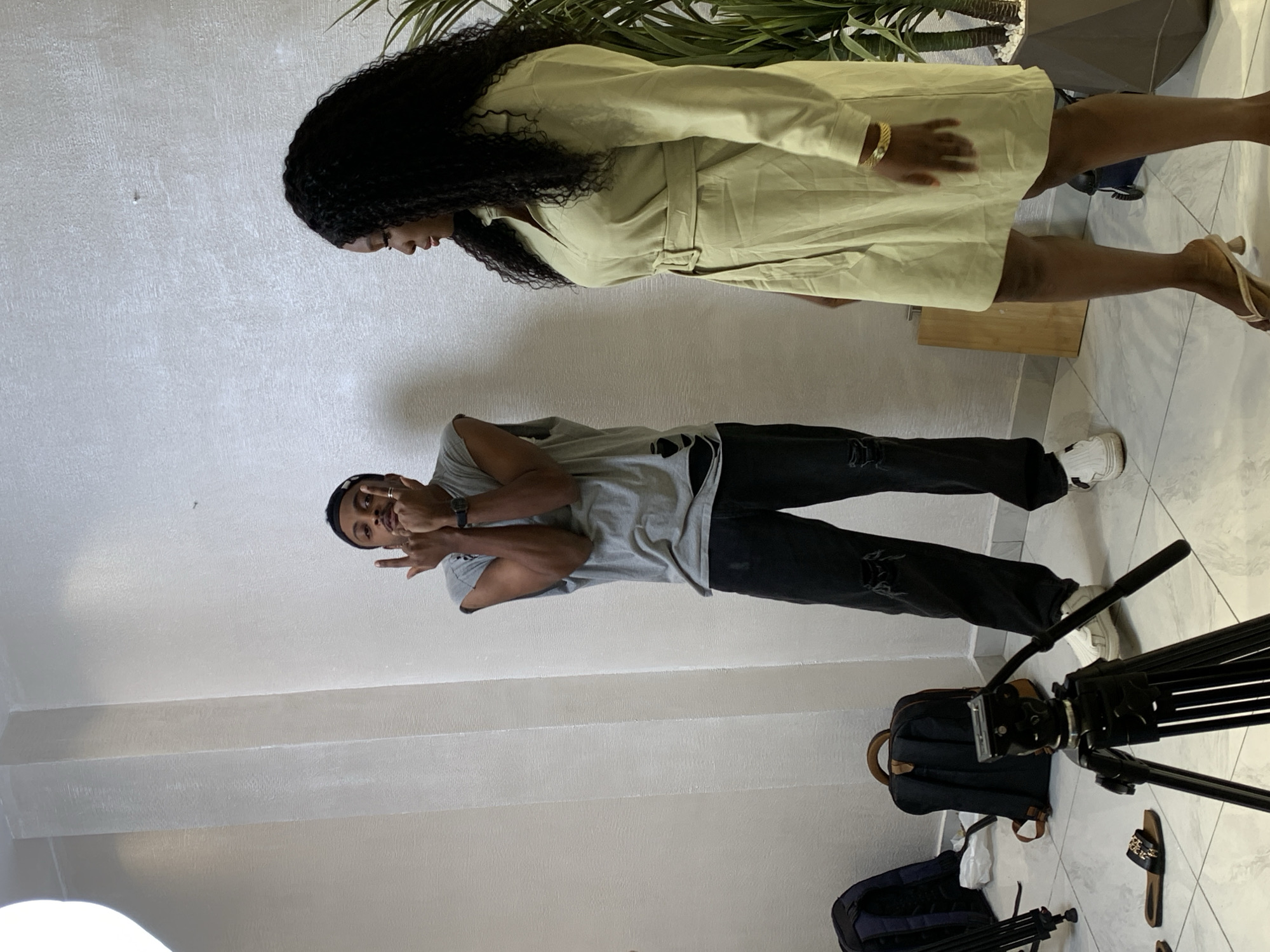 The image depicts an indoor scene in Moba, Nigeria, featuring two individuals. On the left, a male with dark skin and a black backward baseball cap wears a torn grey sleeveless t-shirt, black ripped jeans, and white sneakers. He faces forward, holding both hands up to chest level with fingers splayed in a distinct gesture. On the right, a female with dark skin and long, curly black hair wears a light green collared shirt-dress with a matching belt and light-colored high-heeled sandals. She stands in profile, looking towards the right. The environment consists of a textured, light-colored wall and a white tiled floor with grey grout. A black camera tripod is partially visible in the lower-left foreground, along with a pair of black slides, a blue backpack, and a black backpack on the floor. A tall, leafy potted plant in a dark container with white stones is situated to the right of the female. A partial softbox or lighting fixture is visible in the upper-left corner of the frame.