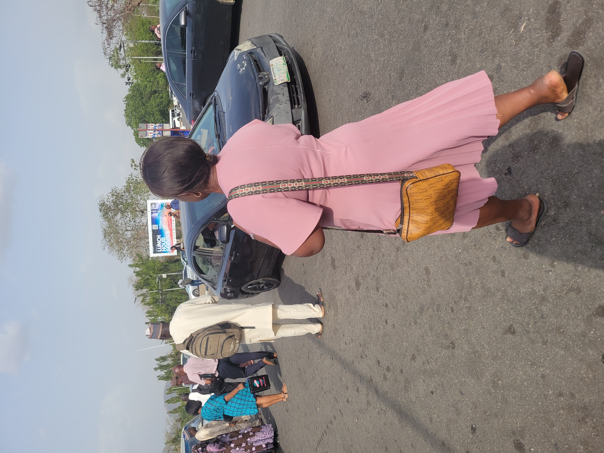 crowded street scene in Abuja, Nigeria. Several people are walking alongside stationary vehicles. A woman in a pink dress with a brown purse and Gucci-branded strap is in the foreground. A man in a white outfit and a backpack is walking behind her. Other pedestrians are visible, some with traditional attire. Cars are lined up in the road, including a dark blue sedan with a visible license plate. In the background, a billboard is visible. The environment is a typical urban setting with trees and other buildings in the distance.