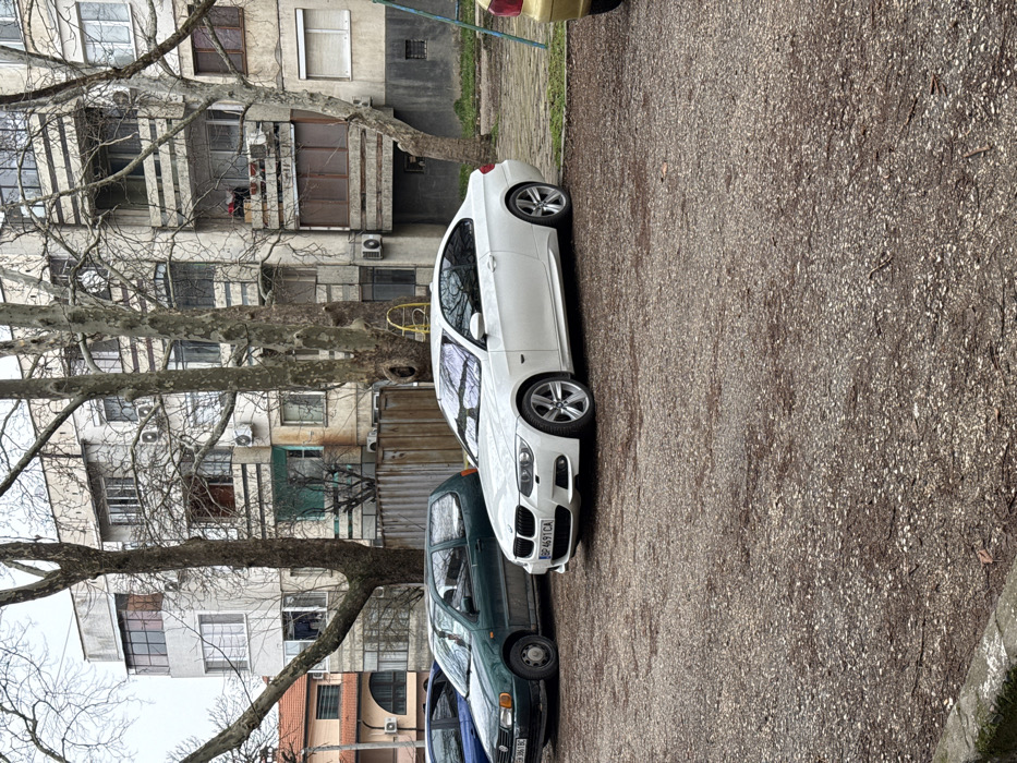 The image depicts an outdoor residential scene in Cherven Bryag, Bulgaria, under an overcast sky. The ground in the foreground consists of an unpaved parking area covered in light-colored gravel and dark soil, with a concrete curb visible at the lower left. Three vehicles are prominently parked. In the center, a white two-door BMW coupe (E92 3-series) with Bulgarian license plate "BP 4691 CA" is parked facing left. Behind it and slightly to the left, a dark green three-door Volkswagen Polo hatchback (Mk3) with Bulgarian license plate "BP 3861 BC" is parked. A dark blue vehicle is partially visible behind the green Polo, and a gold/yellow vehicle is partially visible on the far right, its rear quarter appearing behind the white BMW. In the midground, several large, bare deciduous trees, identifiable as Sycamores by their mottled bark, stand between the parked vehicles and the background structures, partially obscuring them. To the right of the vehicles, sparse patches of grass and sections of what appear to be playground equipment, including a yellow metal structure and a light blue metal pole, are visible. The background is dominated by a multi-story, aged concrete residential apartment building. The building's facade is discolored and features numerous windows, some with drawn blinds or curtains, and several open and enclosed balconies. Multiple external air conditioning units are mounted on the exterior walls. On an upper-floor open balcony, red objects are visible, and on a lower balcony, clothes are hanging to dry. To the far left, behind the green Polo, a section of an older building with a terracotta tiled roof is visible. A corrugated brown metal fence separates a portion of the parking area from the apartment building. No individuals are present in the scene.