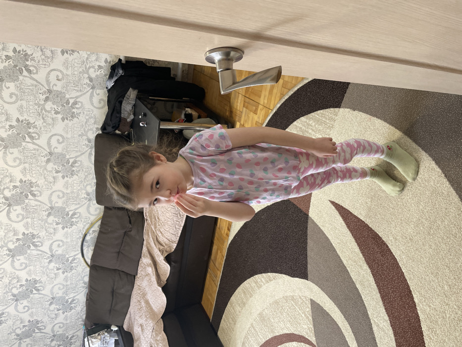 The scene depicts the interior of a residential dwelling in Sarapul, Russia. A young female child, estimated to be between 4 and 6 years old, stands centered in the frame, facing the viewer. She has light brown hair, pulled back, and is wearing a light-colored short-sleeved top with a multi-colored irregular dot pattern, light pink leggings with a white bunny or cloud pattern, and light green socks. She holds a small, pink, translucent object to her mouth with her right hand, appearing to be in the process of consuming it. The floor is partially covered by a large, circular patterned rug in concentric shades of cream, brown, and dark brown. Beyond the rug, a light wood-colored parquet or laminate floor is visible. To the right, a light-colored wooden door is slightly ajar, revealing a brushed metal lever-style doorknob. In the background, a dark brown sectional sofa is positioned against a wall. A light pink quilted throw blanket is draped over a portion of the sofa. To the right of the sofa, a small, dark-colored side table holds various folded dark clothing items and a few small metallic objects. The wall behind the furniture is covered with light-colored wallpaper featuring a repeating pattern of stylized grey and white floral or botanical motifs. The room is uniformly illuminated.