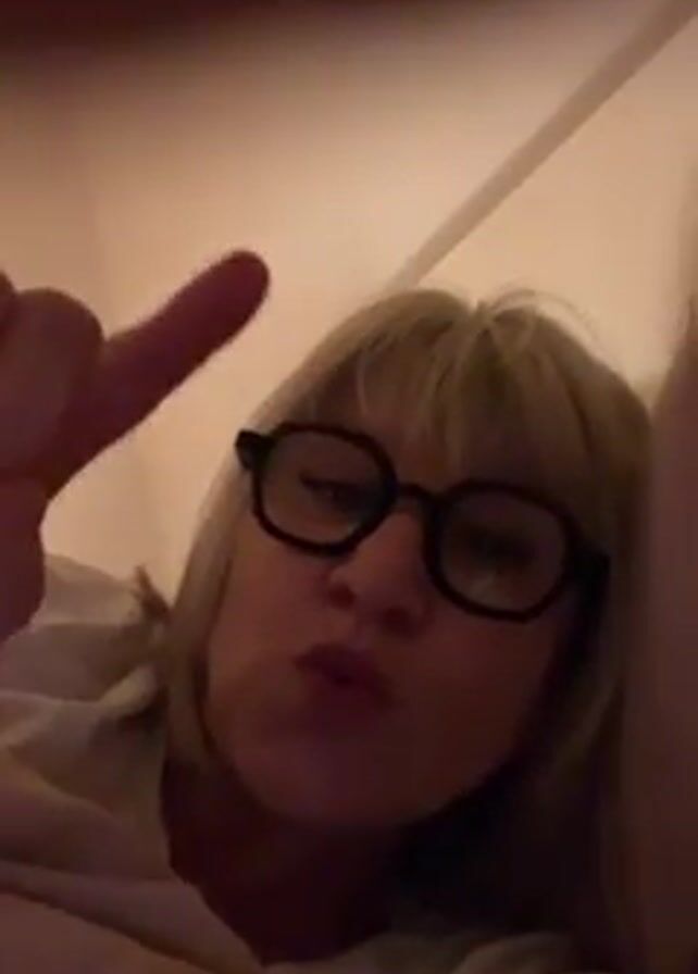 A woman with short blonde hair and black-rimmed glasses is lying down, possibly in bed, with a peach-colored blanket or sheet visible. The lighting is warm and soft. She makes a kissing face and then holds up her hand in a gesture that looks like a small finger gun.