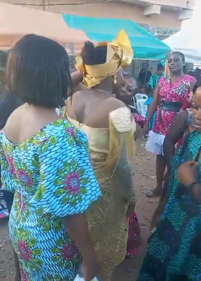 group of African women, likely at a celebration or party. They are dressed in bright, patterned fabrics and some are wearing headwraps. They appear to be dancing and enjoying themselves, with some smiling and raising their hands. In the background, there's a building and a tent, suggesting an outdoor event. The camera moves around the group, capturing the lively atmosphere.