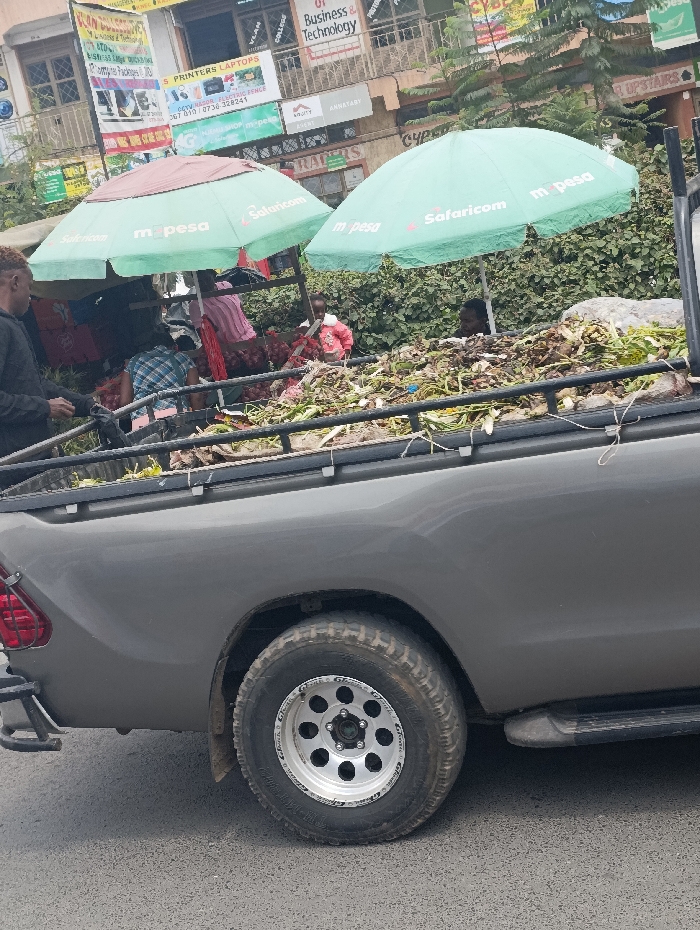 The image depicts a street scene in Matungulu west ward, Kenya. In the foreground, the rear section of a dark grey pickup truck is visible on an asphalt surface. The truck's bed is loaded with a substantial quantity of organic waste, including plant matter, leaves, and various debris. The vehicle features a silver multi-spoke alloy rim on its rear wheel, fitted with a rugged-tread tire, and a black step bar below the passenger door. Behind the pickup truck, a market stall operates under two large, light green umbrellas, both branded with "Safaricom" and "m-pesa" logos. Several individuals are present in this market area. A male with light-colored hair, dressed in a dark shirt, stands to the left. Under the umbrellas, multiple people are engaged in market activities; a person in a pink shirt is visible behind a counter, another in a blue plaid shirt is bent over, and a small child in a red jacket stands near baskets of red produce, likely onions. The head of another individual is partially visible behind the truck's organic load, situated under the right umbrella. The background features multi-story commercial buildings displaying various business signs, including "BUSINESS & TECHNOLOGY," "PRINTERS LAPTOPS," "CCTV INSTALLATION," and partial visibility of "EQUITY BANK" signage. Dense green foliage and bushes are present behind the market stalls and between the structures. The scene is illuminated by natural daylight.