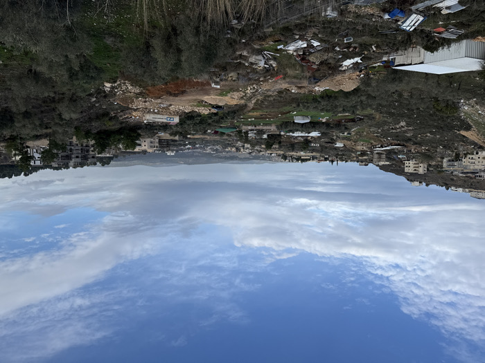 A landscape shows a hillside with scattered buildings and vegetation, appearing like a town or village. The foreground features a blue sky with white clouds. The hillside contains construction, possibly new development. The background reveals a distant mountain range, barely visible through the haze. The photograph appears to be rotated 180 degrees.