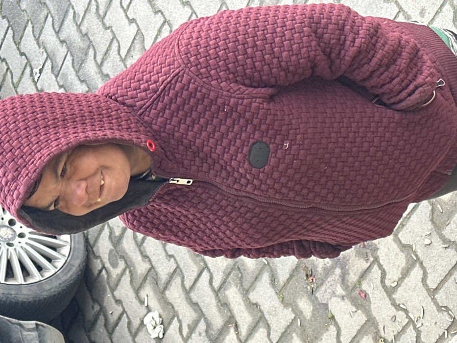 An individual is depicted in a medium shot, standing outdoors in Plodovitovo, Bulgaria. The subject, an adult with medium skin tone, wears a dark red/maroon hooded jacket with a textured, possibly quilted, pattern. The hood is up. The jacket is fastened with a silver zipper, partially unzipped, and features a dark oval patch on the left chest area. A red loop is visible near the collar. The individual's head is turned slightly to the left, with eyes directed towards the left side of the frame. A smile or grimace is present, exposing multiple discolored upper and lower teeth, including a noticeable gap between the two upper central incisors. The background consists of a grey interlocking concrete paver surface laid in a herringbone pattern. In the upper left, a dark vehicle tire and a silver multi-spoke wheel rim, consistent with a Mercedes-Benz, are partially visible. Scattered debris on the pavement includes crumpled white items, several cigarette butts, and small pieces of dark plant matter.