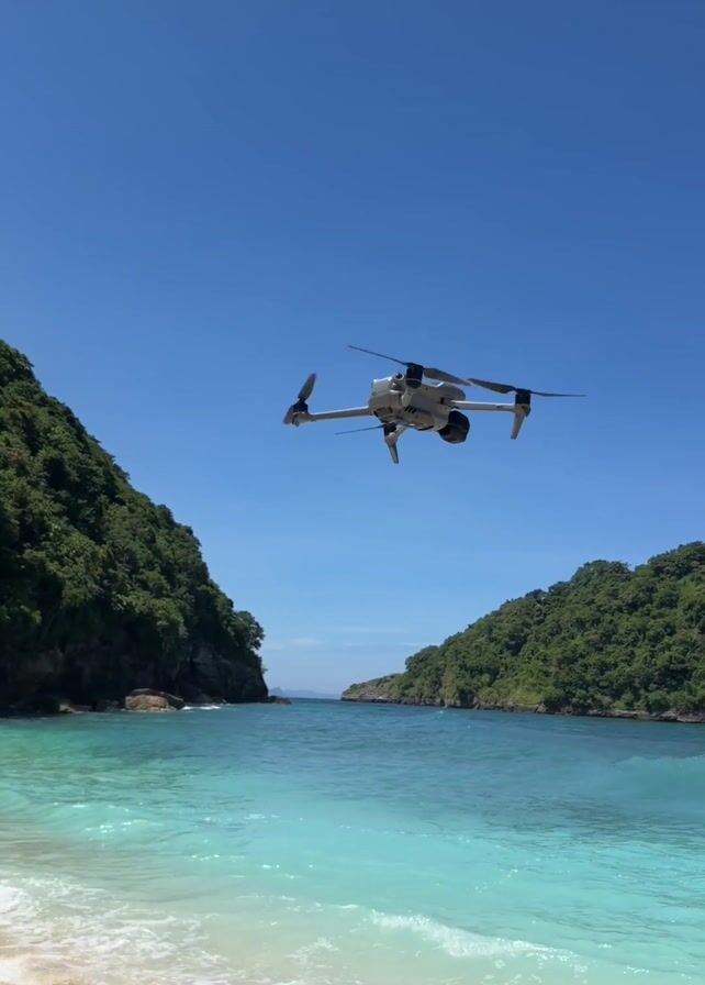 A drone flies in the air above a tropical beach. The beach has white sand and turquoise water with small waves. The beach is bordered by hills covered in green vegetation. The sky is blue and cloudless. The drone has four propellers and a camera.