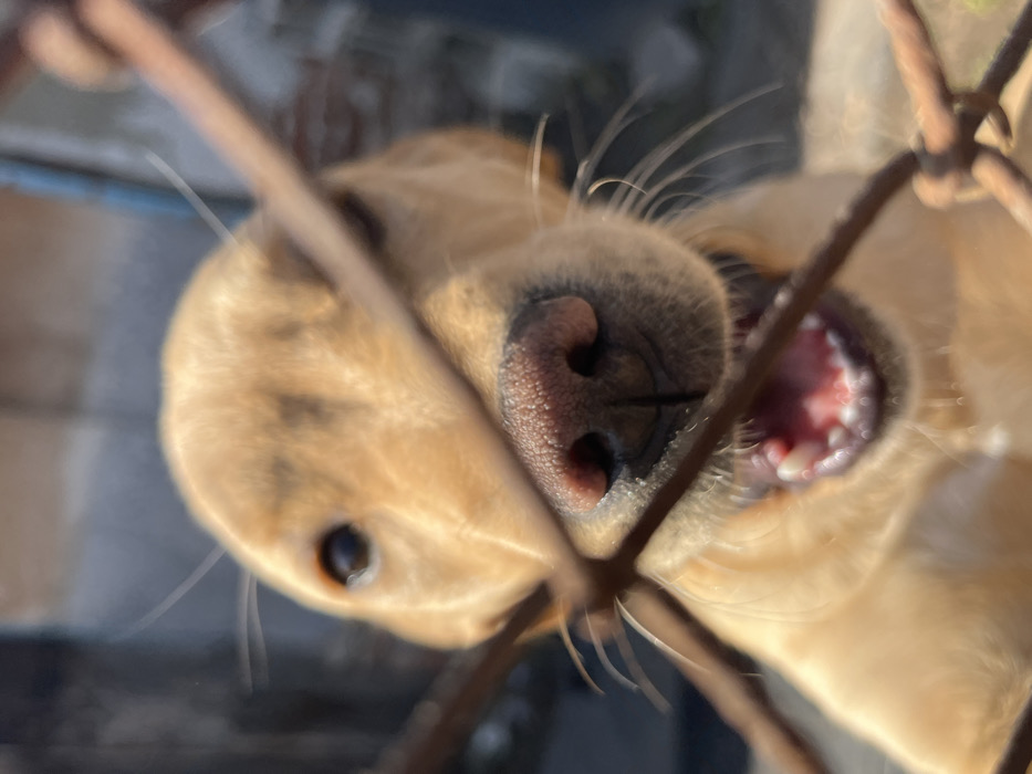 - "A light tan-colored canine, possibly a Labrador Retriever or mix, is depicted in a close-up, head-on shot, partially obscured by a rusted wire fence in the immediate foreground" by FM-ufW5l2, licensed under CC BY 4.0