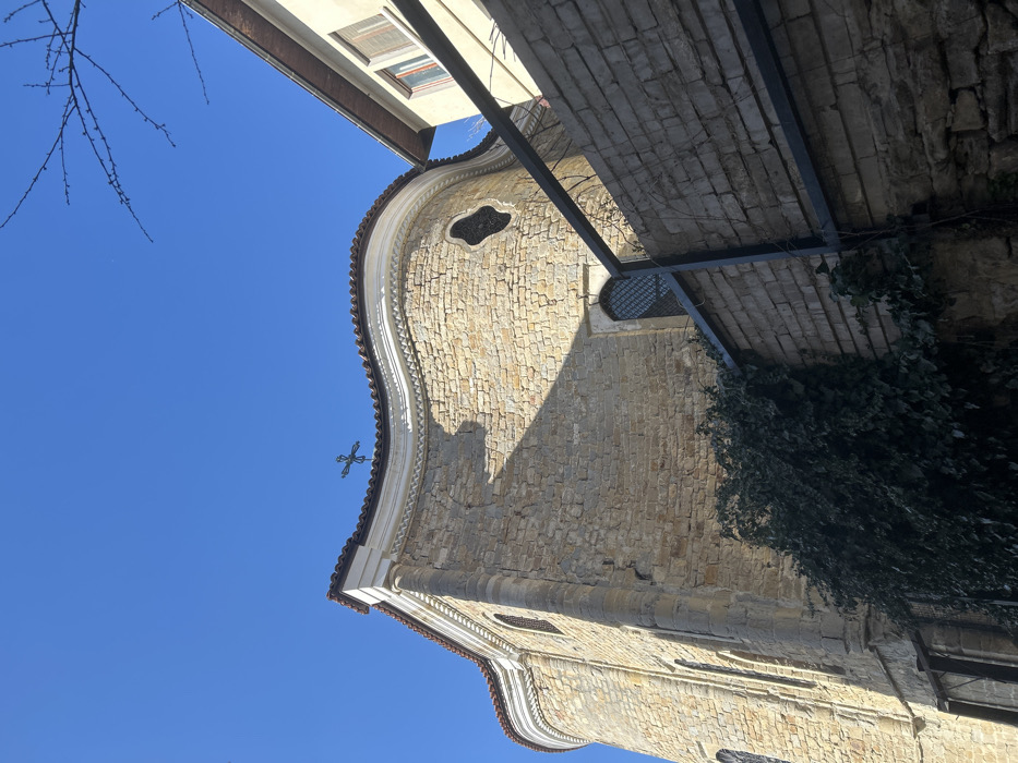 The image presents a low-angle view of a historic stone church situated in the city of Unknown, Unknown, under a clear blue sky. The central subject is a robust, light-brown stone building constructed with irregularly cut blocks, featuring a rounded apse or tower. Its roof is composed of red tiles and is bordered by a decorative white cornice. A black metal cross, approximately 0.5 meters tall, is prominently affixed to the highest point of the roofline on the rounded section. The building's stone facade displays several narrow, arched windows fitted with dark metal grilles; one distinct quatrefoil-shaped window is visible on the curved section. Cracks are evident in the stonework, indicating age. Strong sunlight from the upper left casts a large shadow across the right portion of the building's facade. To the upper right, a portion of an adjacent cream-colored building with a brown-framed window and an overhanging brown-eaved roof is visible. In the foreground, a multi-layered wall, composed of rough stone at the base and lighter bricks above, runs horizontally across the scene. Black metal bars or a framework are installed horizontally above this wall, partially obscuring the view of the church. Dense, dark green ivy or similar climbing vegetation covers parts of the lower church wall and extends onto the foreground wall. Bare, dark tree branches are visible against the blue sky in the upper right corner. No people are present, and no actions or interactions are depicted.