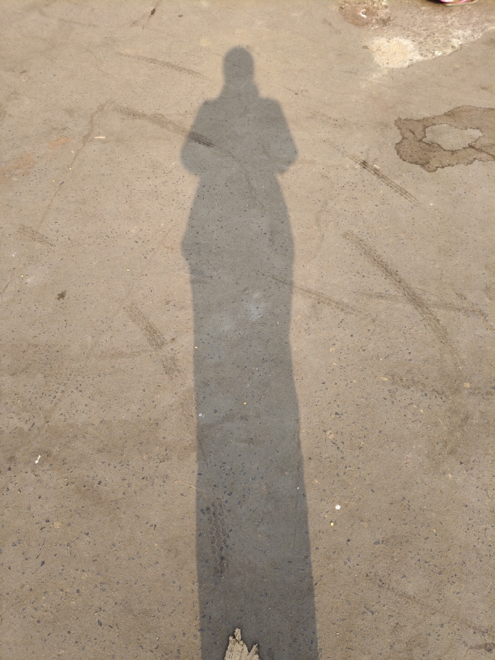 The image displays the elongated shadow of an individual cast upon a light gray, granular paved surface, likely concrete or asphalt, in Bardhaman, India