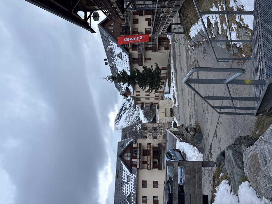 The image displays an alpine village street scene in Saint-Sorlin-d'Arves, France, under an overcast, grey sky. The environment indicates a winter or early spring setting, with snow patches present on the ground and building rooftops. In the immediate foreground, on the right, a set of grey metal grate stairs with a corresponding metal handrail descends out of view. A yellow mark is visible on the right-side railing. To the left, large grey boulders and sparse, dry grass are interspersed with remnants of snow. The midground is dominated by a paved road that curves through the village. On the left, a wooden fence borders a parking area containing a light blue Volkswagen Golf, partially obscured by a dark vehicle, both parked on snow-dusted ground. Behind this, a multi-story building with a light-colored facade, brown window frames, and wooden balconies features a dark grey roof with snow accumulation. Centrally, a tall, slender evergreen tree stands prominently. To its right, another multi-story building, exhibiting a light-colored facade and wooden upper sections, displays a vertical red banner with white, reversed text. This building also has multiple balconies and a snow-covered dark roof, with a wooden elevated walkway extending from its right side. Further along the curving road, a smaller, light-colored building with a closed garage door is visible. The background features rugged, snow-covered mountains under the consistently heavy, grey cloud cover. No individuals or active interactions are depicted within the scene.