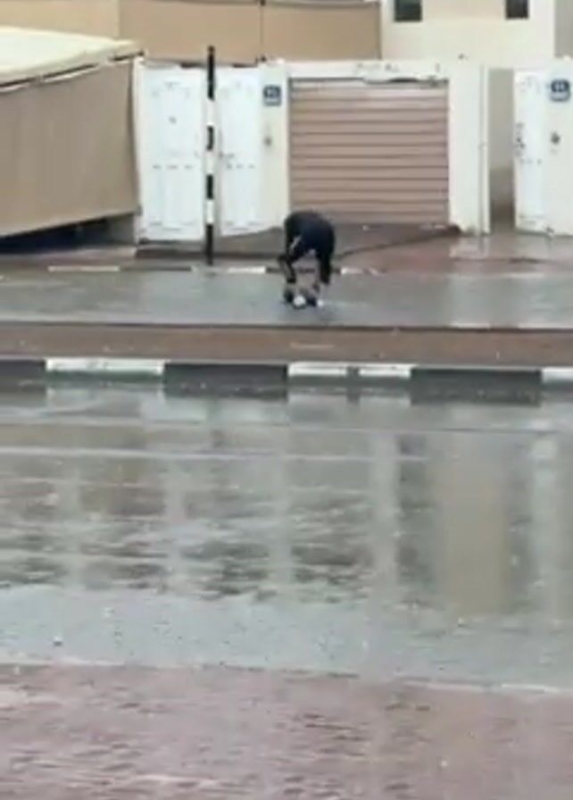 street scene on a rainy day. Water covers the road and sidewalks. Several people are visible, including a man in dark clothing who is initially bent over and then stands up, tossing an object into the air. Another person, who appears to be a younger male, is standing near a carport. Other people can be seen further away, near buildings.