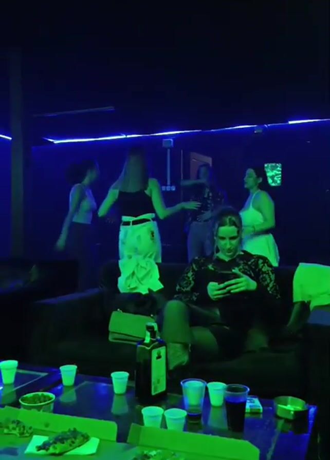 In a dimly lit nightclub, six women occupy a lounge area. Five are dancing with their backs to the camera, while one sits on a black couch, engrossed in her phone. A low table in front of the couch is cluttered with pizza, plastic cups, and a bottle of Jägermeister. The room’s lighting shifts between blue, red, and green, creating a vibrant yet hazy atmosphere. The decor is minimal, focusing instead on the color-changing lights that run along the walls and ceiling.